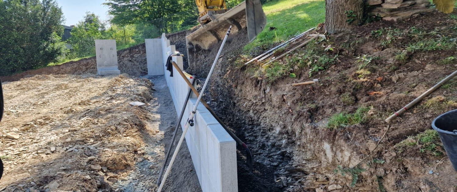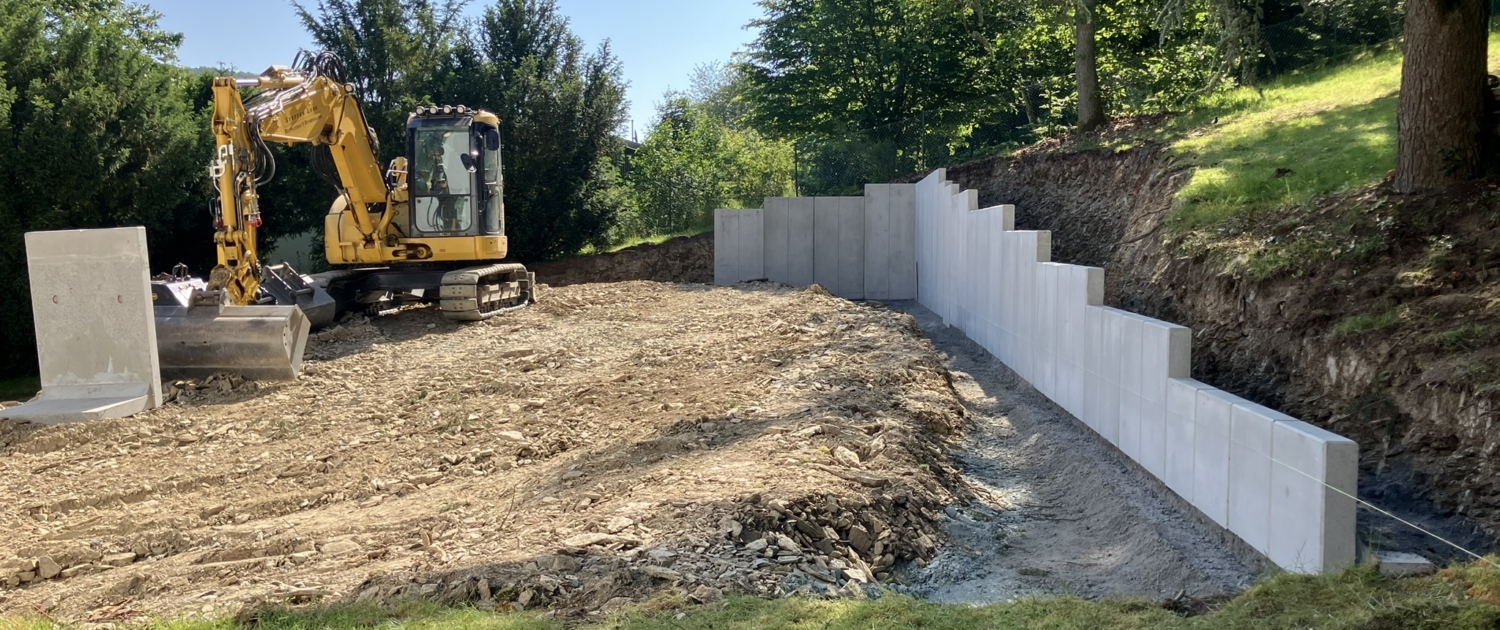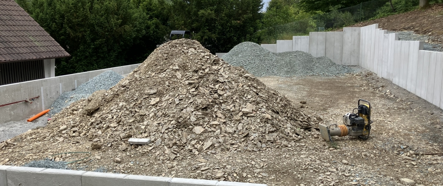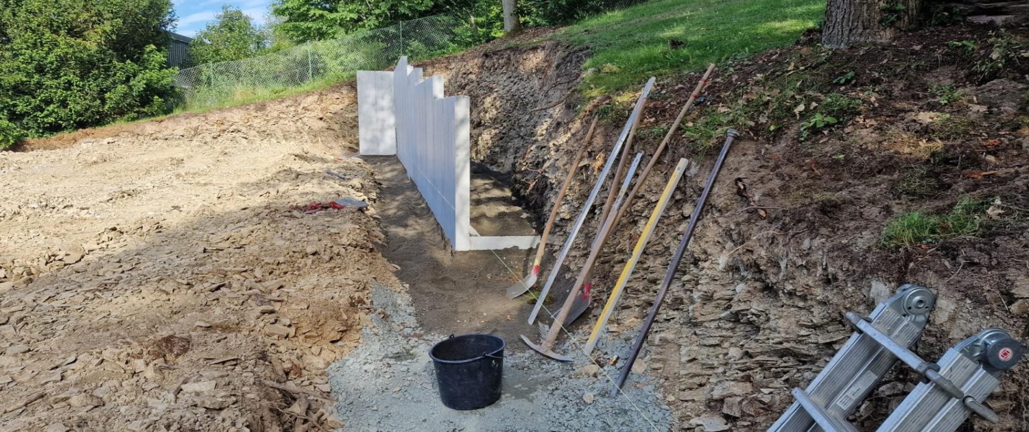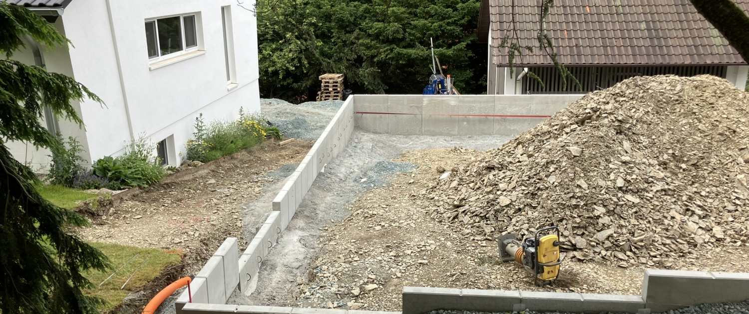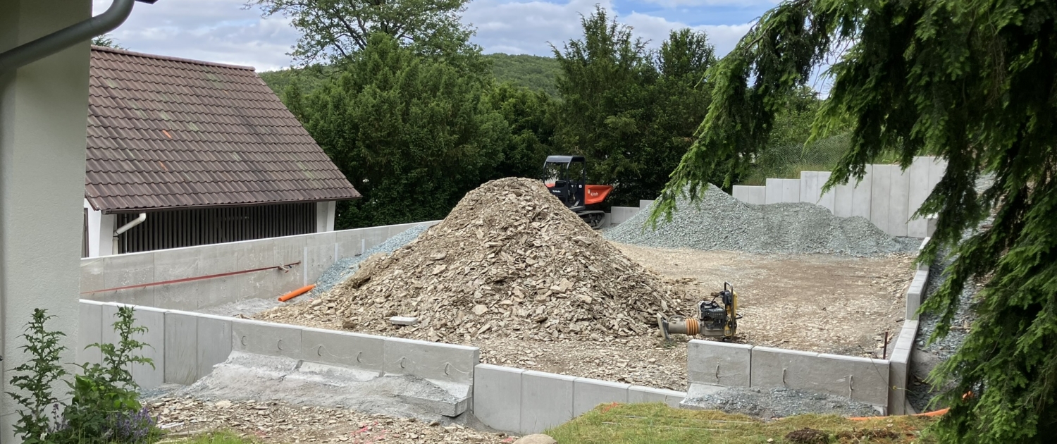 Zum Abstützen des Hangs wurden L-Steine inklusive Drainage-Rohr gesetzt. Natürlich alles in perfekter Flucht.