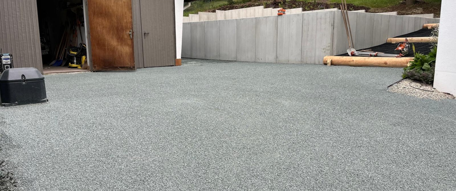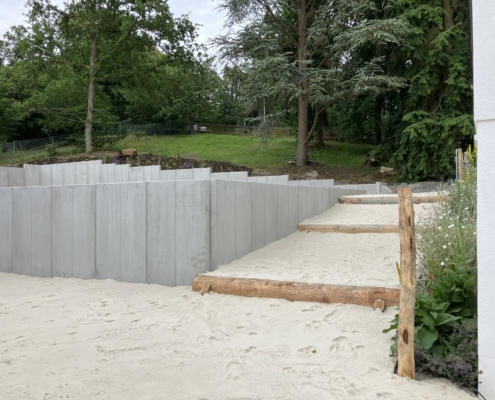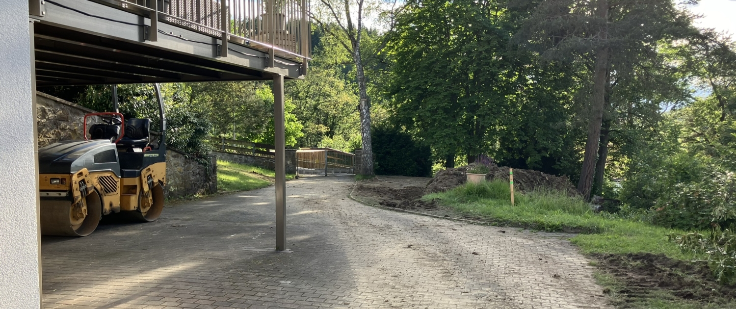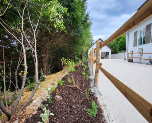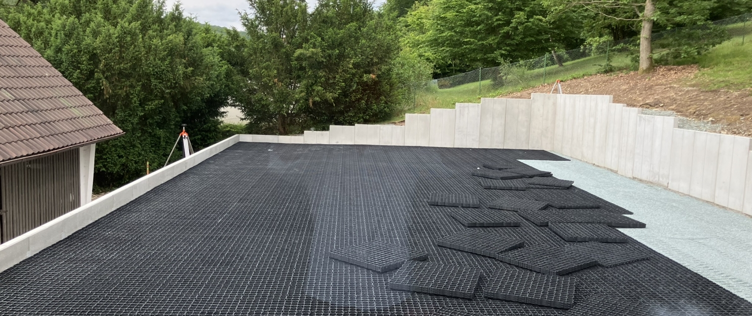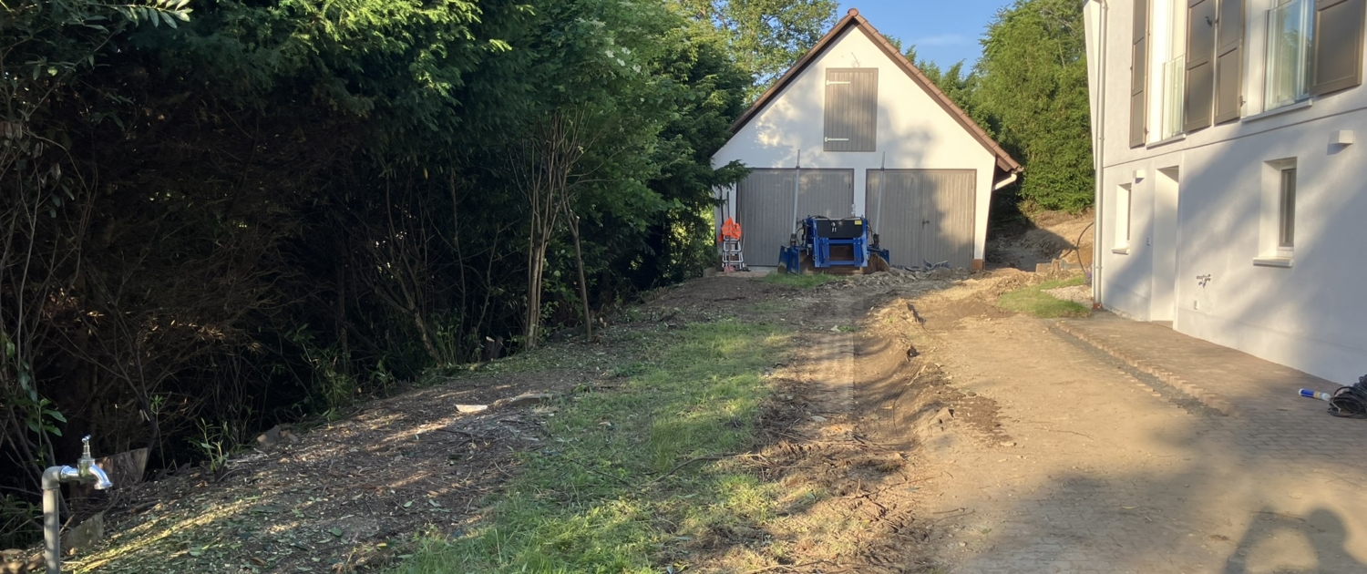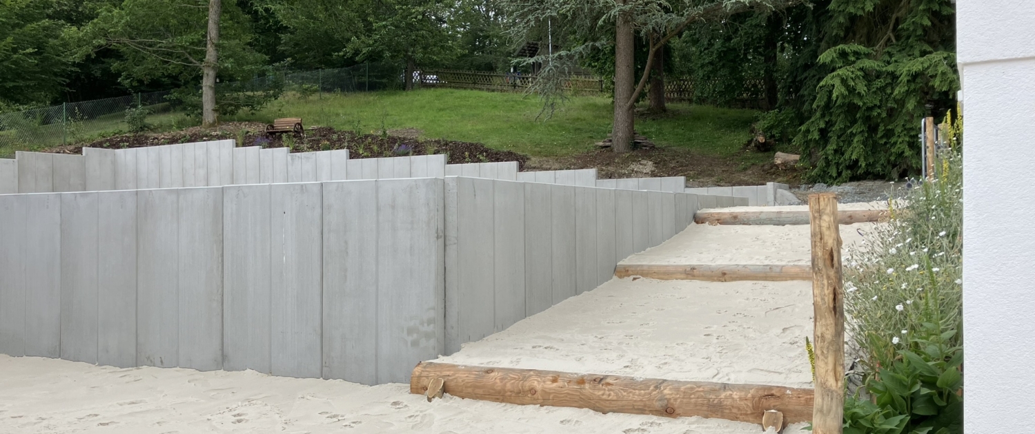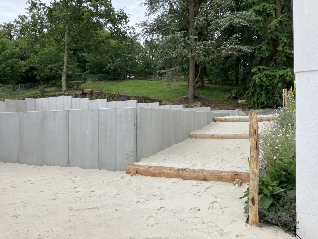 Zum Abstützen des Hangs wurden L-Steine inklusive Drainage-Rohr gesetzt. Natürlich alles in perfekter Flucht.