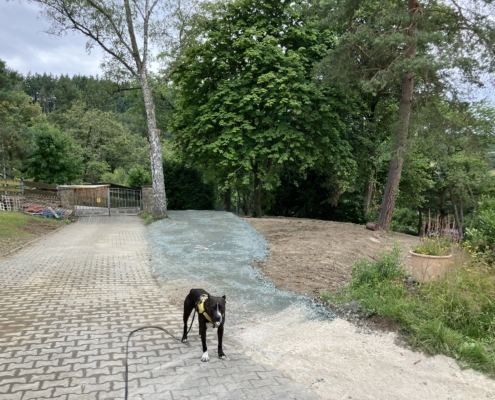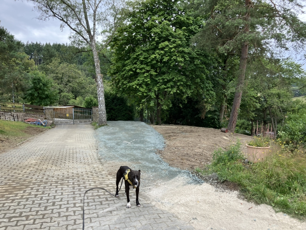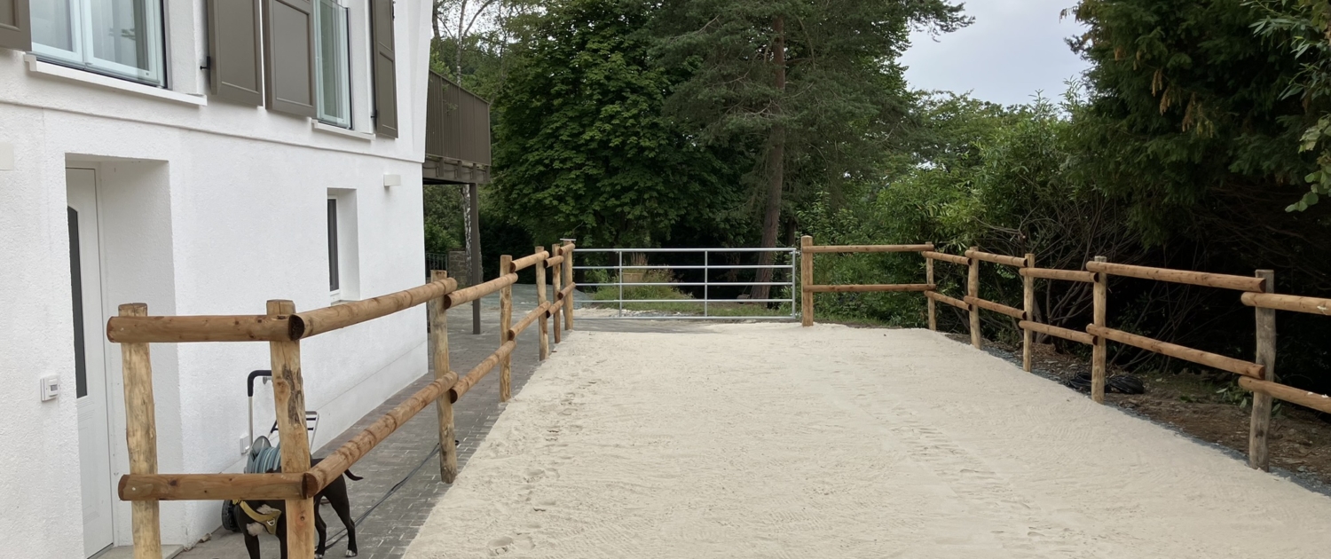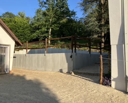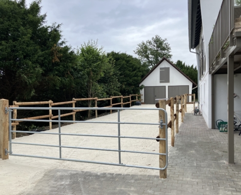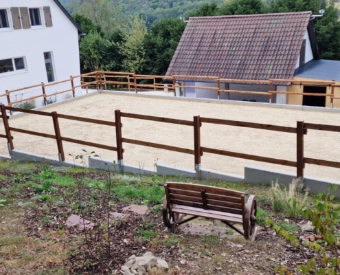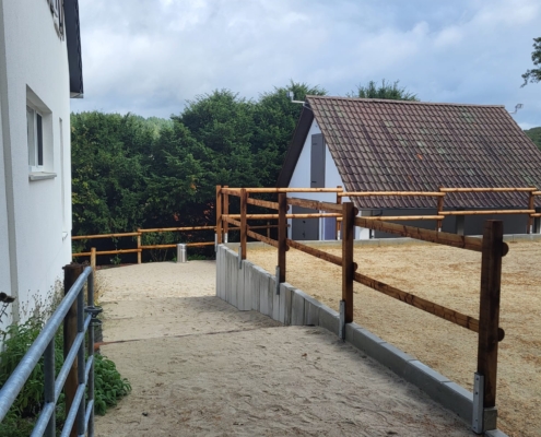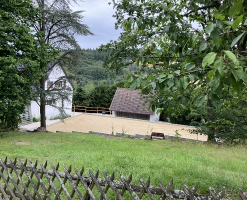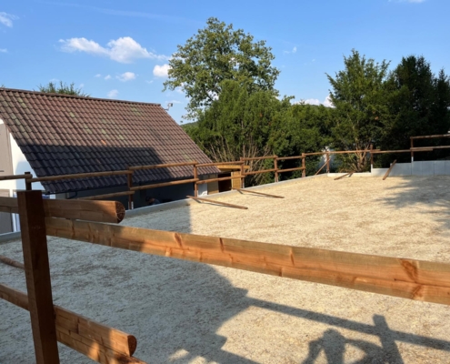 Ein paar Handgriffe hier, ein paar Holzpfähle und Halblatten da und fertig ist ein kleiner aber feiner Bewegungsplatz. Aber wir sind ja noch lang nicht fertig.