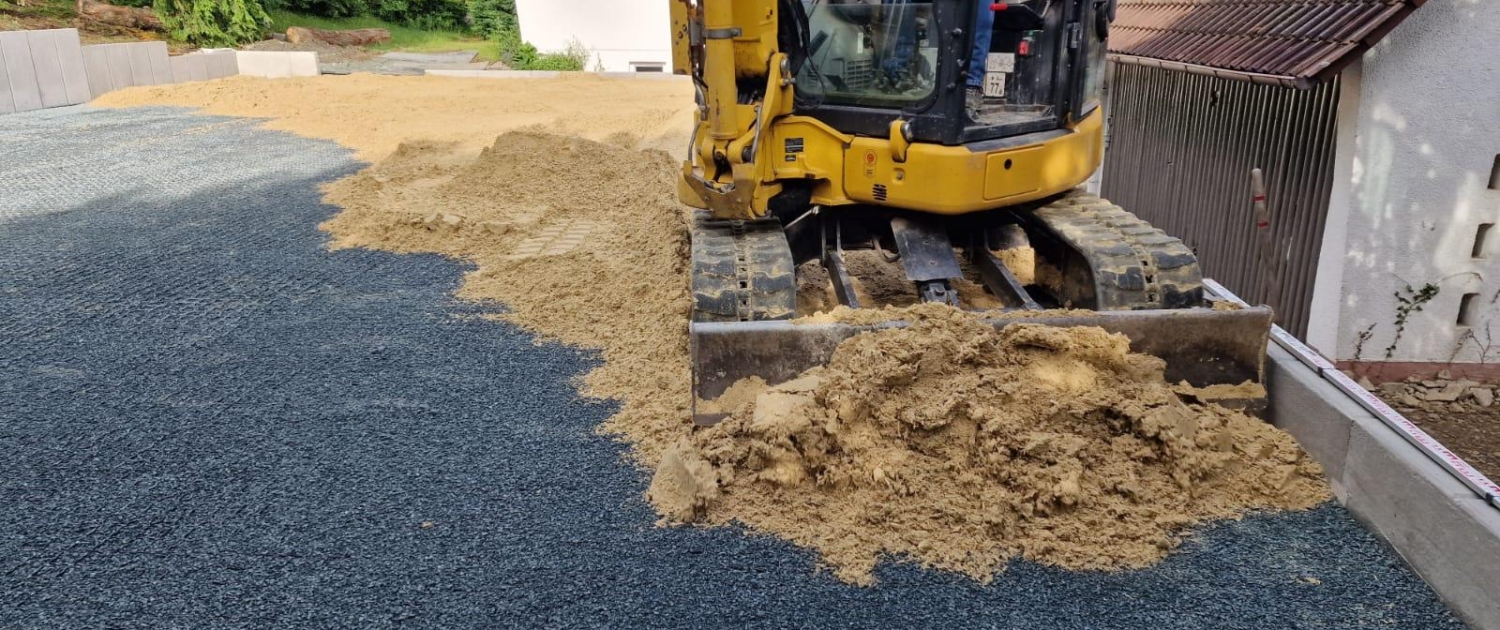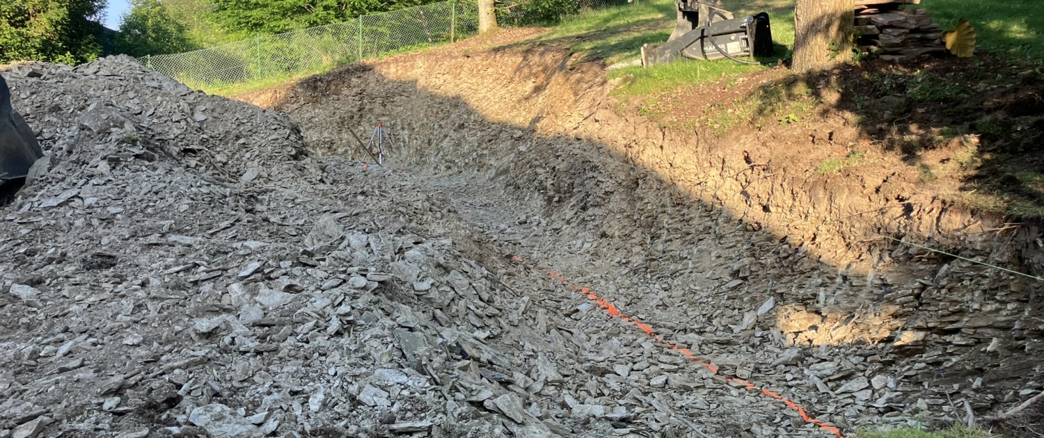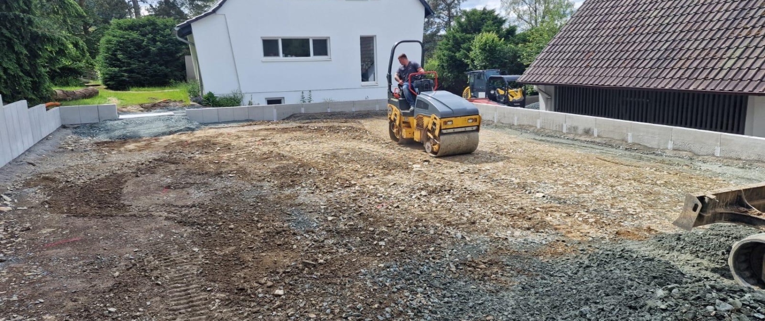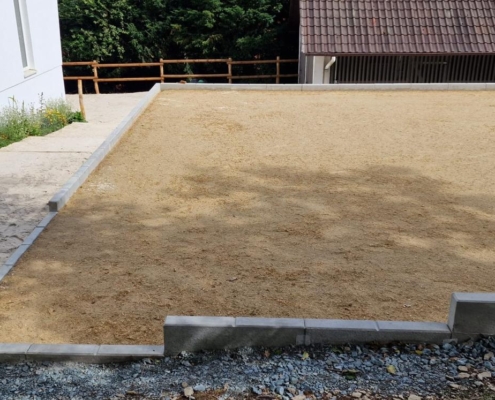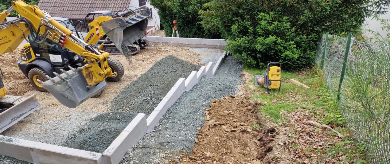 Zunächst schaffen wir eine Grundlage für die Paddockplatten. Durchgeführte Arbeiten: Erdarbeiten, Schotterplanum, instalieren einer Thermotränke und Splittplanum.