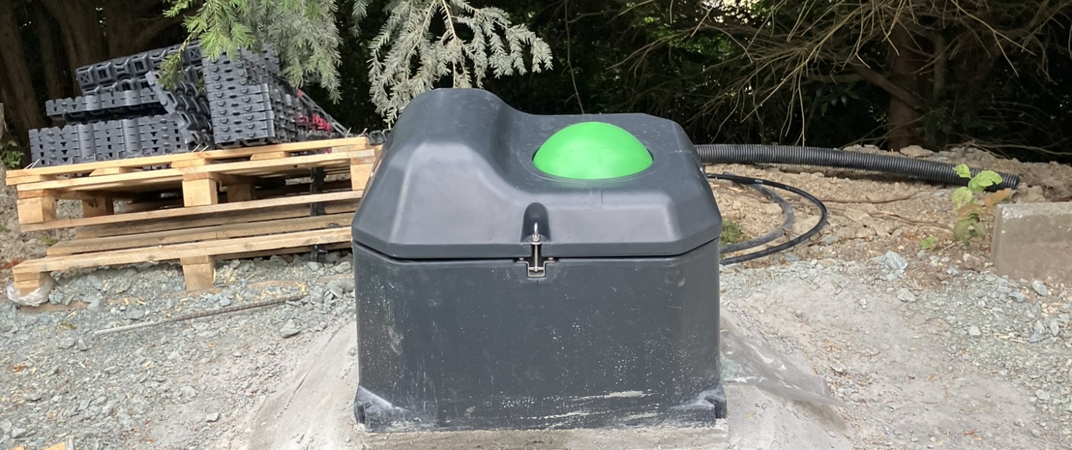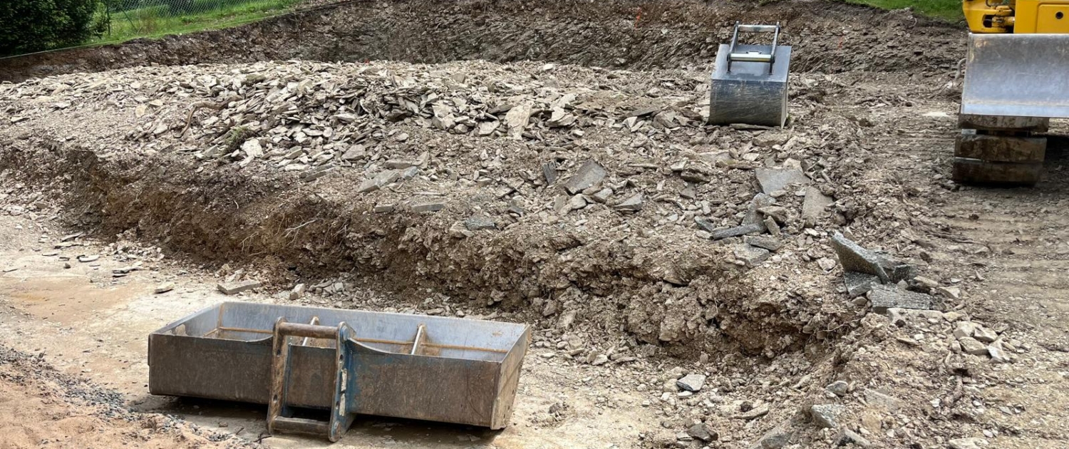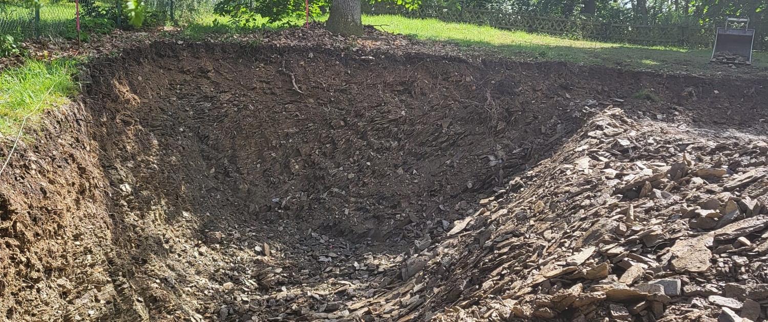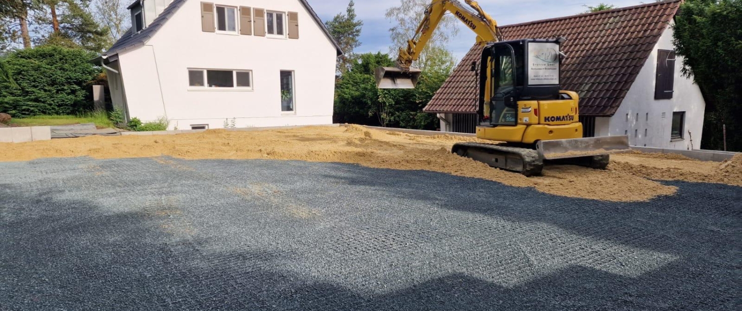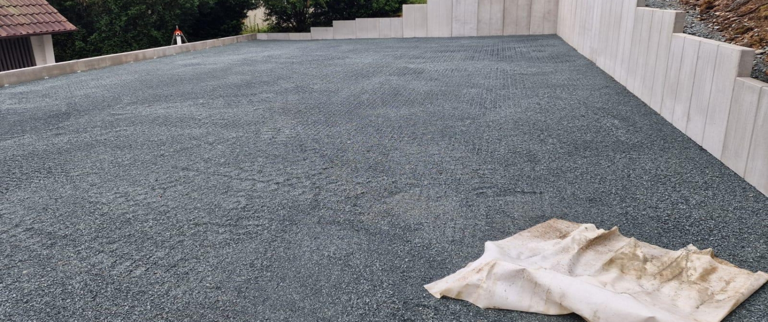 Zunächst schaffen wir eine Grundlage für die Paddockplatten. Durchgeführte Arbeiten: Erdarbeiten, Schotterplanum, instalieren einer Thermotränke und Splittplanum.