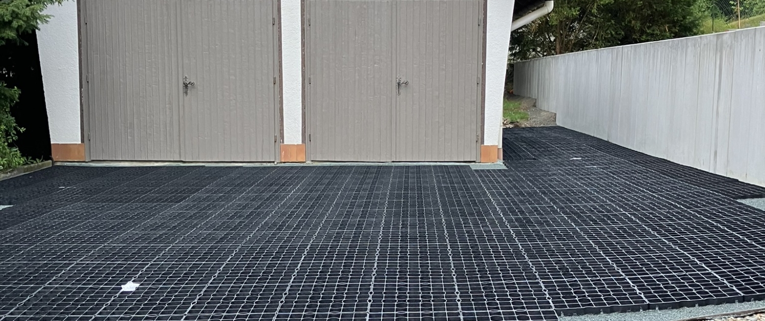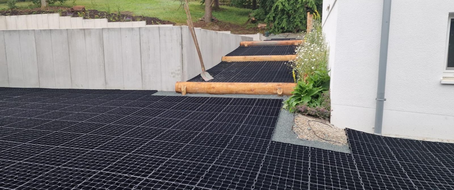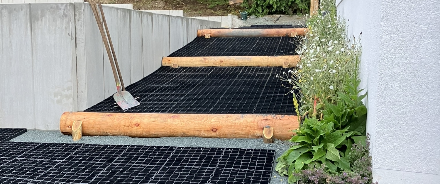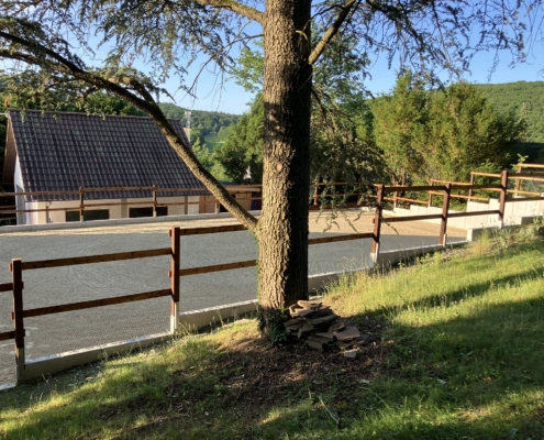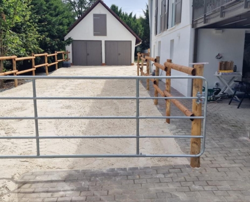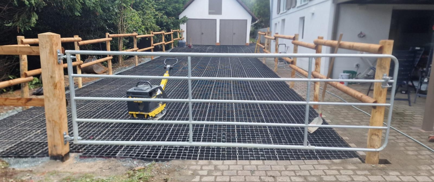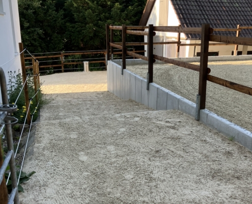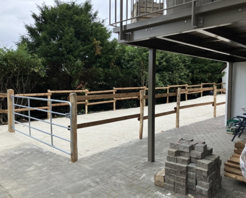 Im nächsten Schritt haben wir die Ridocn RG40 Paddockplatte verlegt und das Paddock mit Robinienpfählen und Halblatten abgegrenzt. Auf den Bildern gut zu sehen, wie flexibel sich die Ridconplatten dem Untergrund anpassen können.