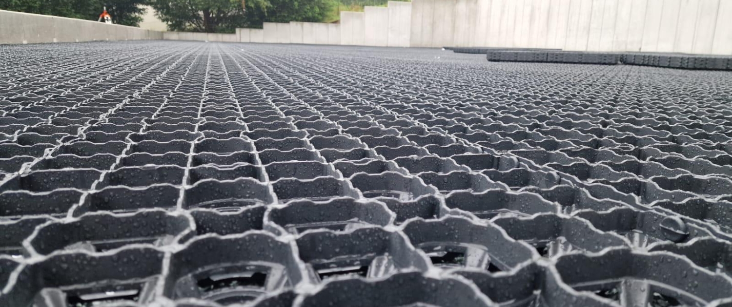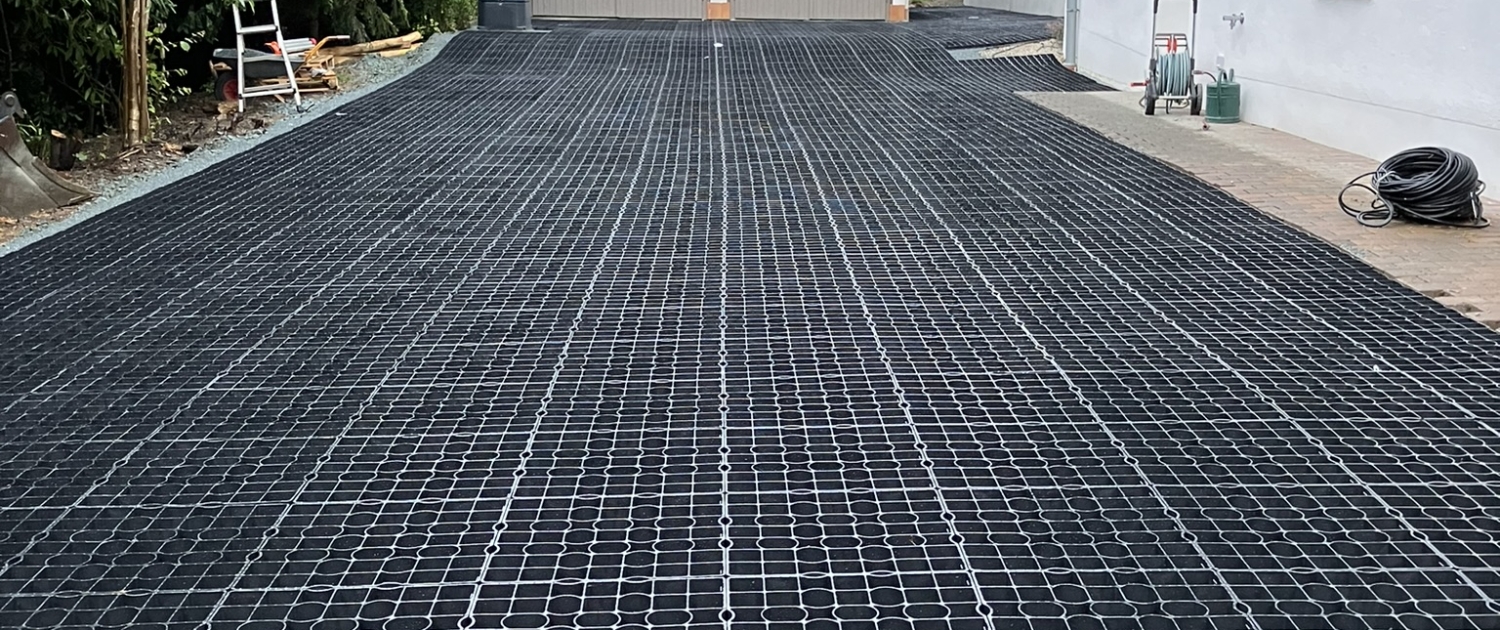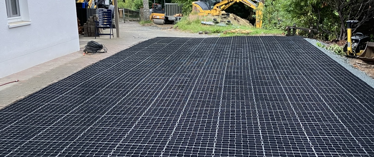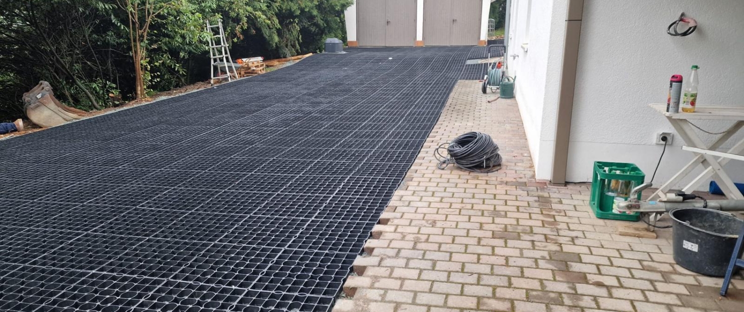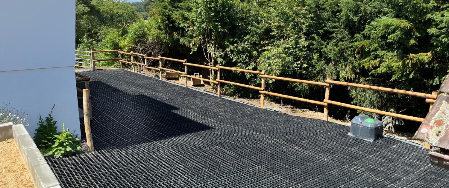 Im nächsten Schritt haben wir die Ridocn RG40 Paddockplatte verlegt und das Paddock mit Robinienpfählen und Halblatten abgegrenzt. Auf den Bildern gut zu sehen, wie flexibel sich die Ridconplatten dem Untergrund anpassen können.