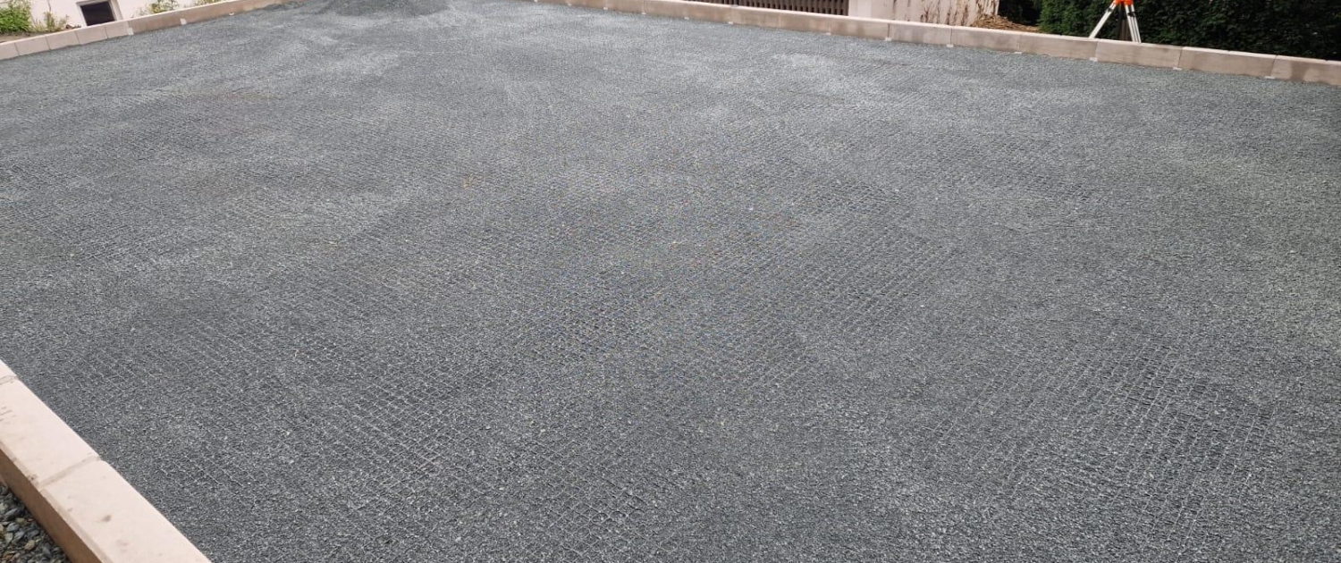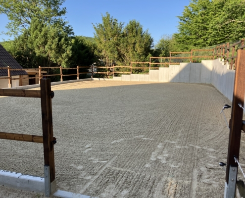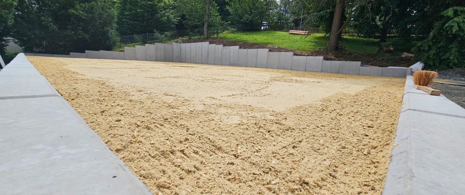 Die RG40 Evolution unseres Partners Ridcon sorgen für eine optimale Gelenkschonung und eine hervorragende Querentwässerung des Platzes. Im nächsten Schritt werden die Reitplatzmatten mit Splitt verfüllt, um sicherzustellen, dass das Wasser versickern kann und sich keine Pfützen bilden. Auf dem Bild ist gut zu erkennen, wie eben das Schotterplanum geworden ist.